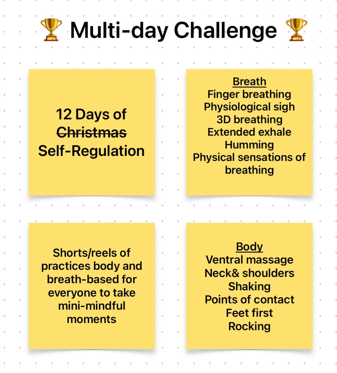 If you do one practice every day (we are talking three minutes or less a day, folks) that will be 12 days of 12 reps πͺof practicing being mindfully in the moment. That repetition goes a long way in rewiring the brain to actually think to do those practices when you need them in the moment. And honestly its more mindfulness and self-regulation than most people will practice in their lifetimes! If you don't like the practice for the day, just do another one for a second time for that day's rep.